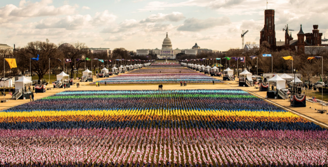 The National Mall, usually filled to the brim with excited Americans anxious to get a look at the new president, was closed to the public, and vast stretches of the district were barricaded and off-limits. Barricades blocked off the area around the Capitol, far more than any previous inauguration. These areas, ordinarily featuring large crowds of people who flock to the city to witness history being made, consisted of flags, representing the Americans who were unable to travel to Washington.