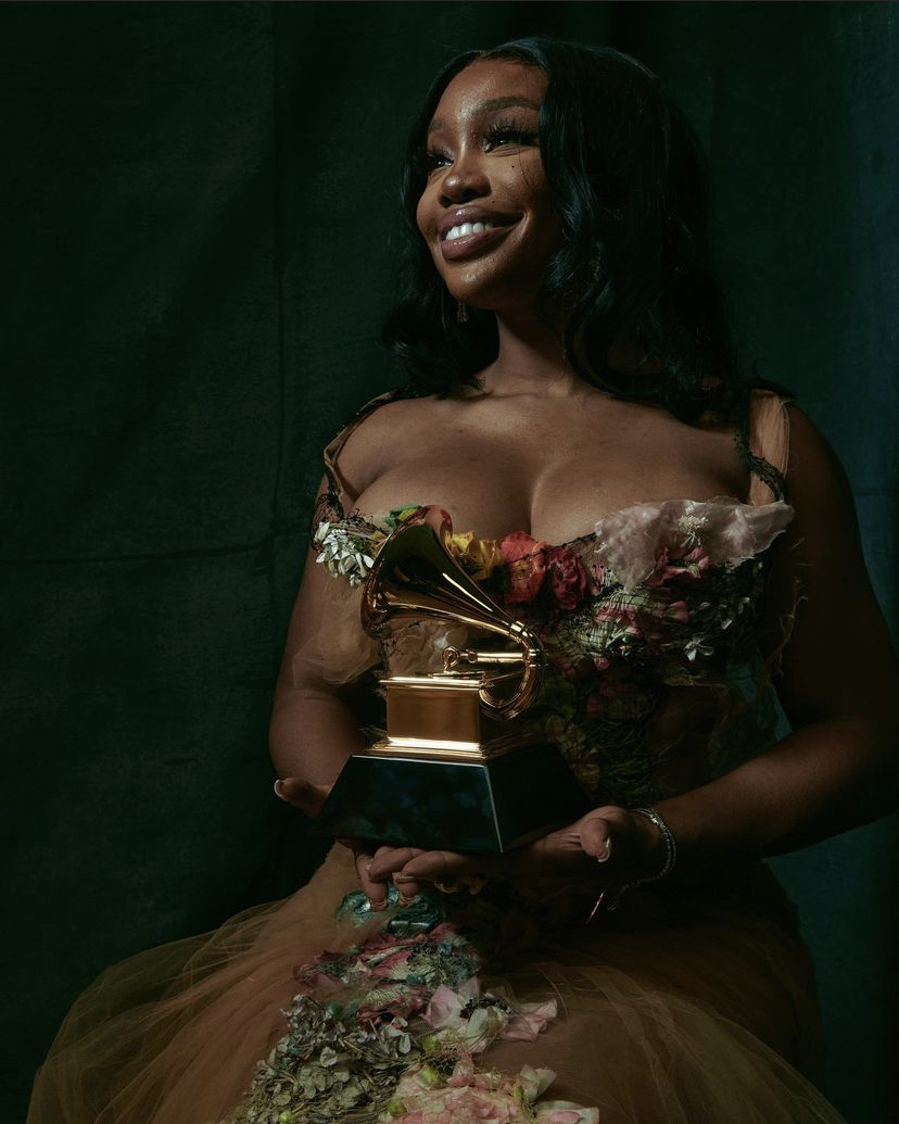 Doja Cat can kiss us more (seriously though). The first-time Grammy winner continued the Versace trend by starting out the night in an ice-queen look that made us want to bow down before her. That is, until, she switched to yet another sequin look in the most precious baby pink to accept her award with collaborator and fellow first-time Grammy winner SZA.