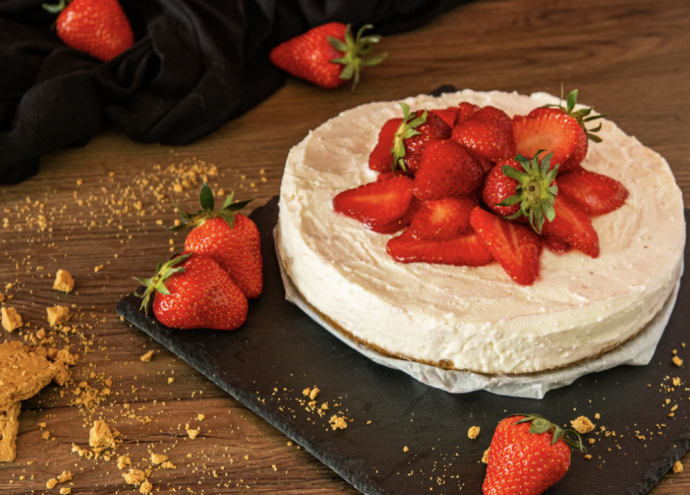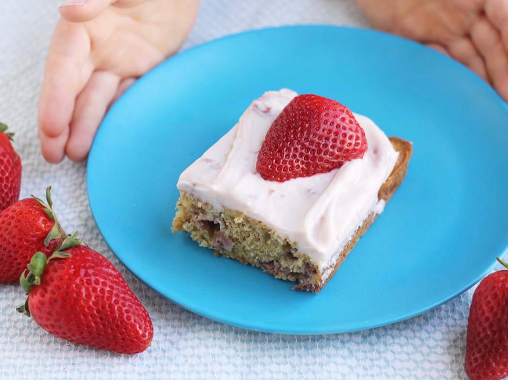 - Spread frosting on top of cooled cake. Add diced strawberries (optional), cut and serve!