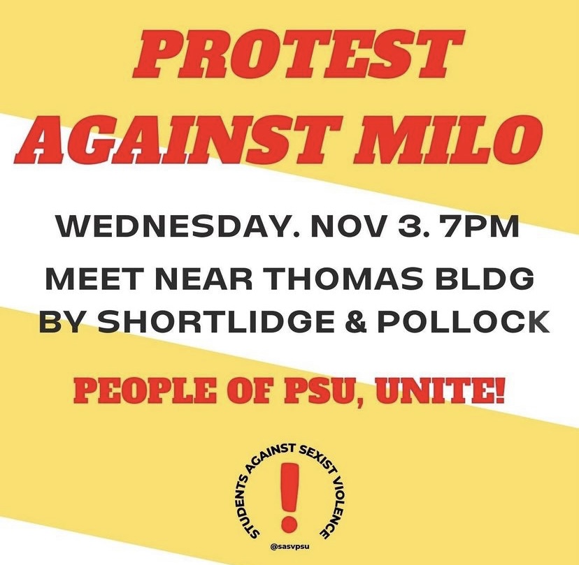 Different organizations and clubs including the Paul Robeson Cultural Center, the Gender Equity Center and C.A.P.S. have created the event in the Heritage Hall called “Love is Louder” where there will be music, food and activities. It is a peaceful alternative on Nov. 3 for people to support each other and spread love instead of hate. There is also a protest being endorsed by student clubs outside the Thomas Building the same time as Milo’s presentation to stand up to him, as well as Uncensored America – the campus group who organized everything – and the Penn State Administration.