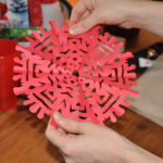 Cut the snowflake into desired shape and open. Use the markers and decorations to adorn the paper portion of the snowflake. Make sure all decorations are flat on the snowflake — otherwise lamination will not be possible.