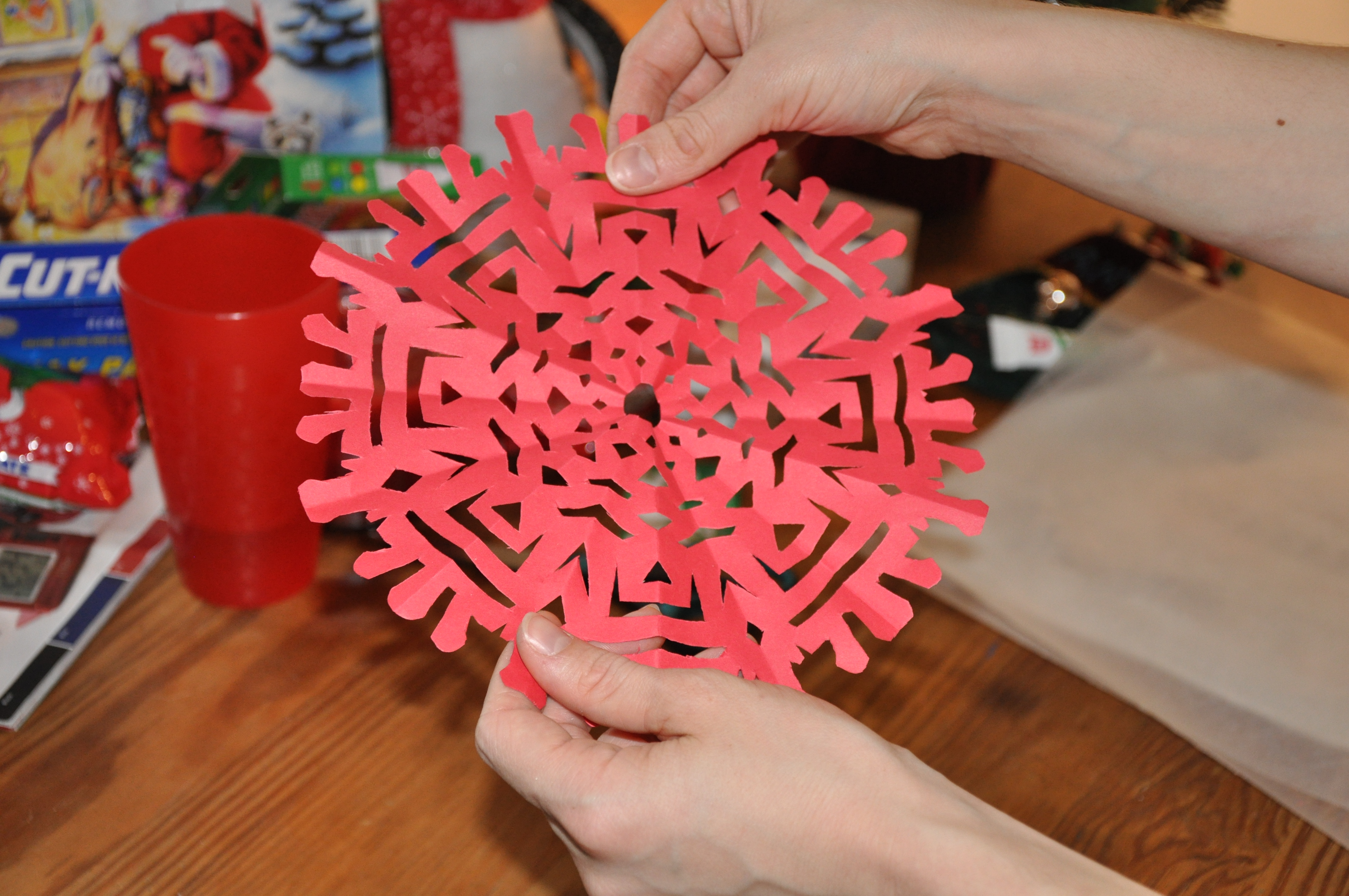 To start, fold your paper into an eight-fold snowflake pattern. Check out this slide show of how to do the easy fold.