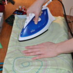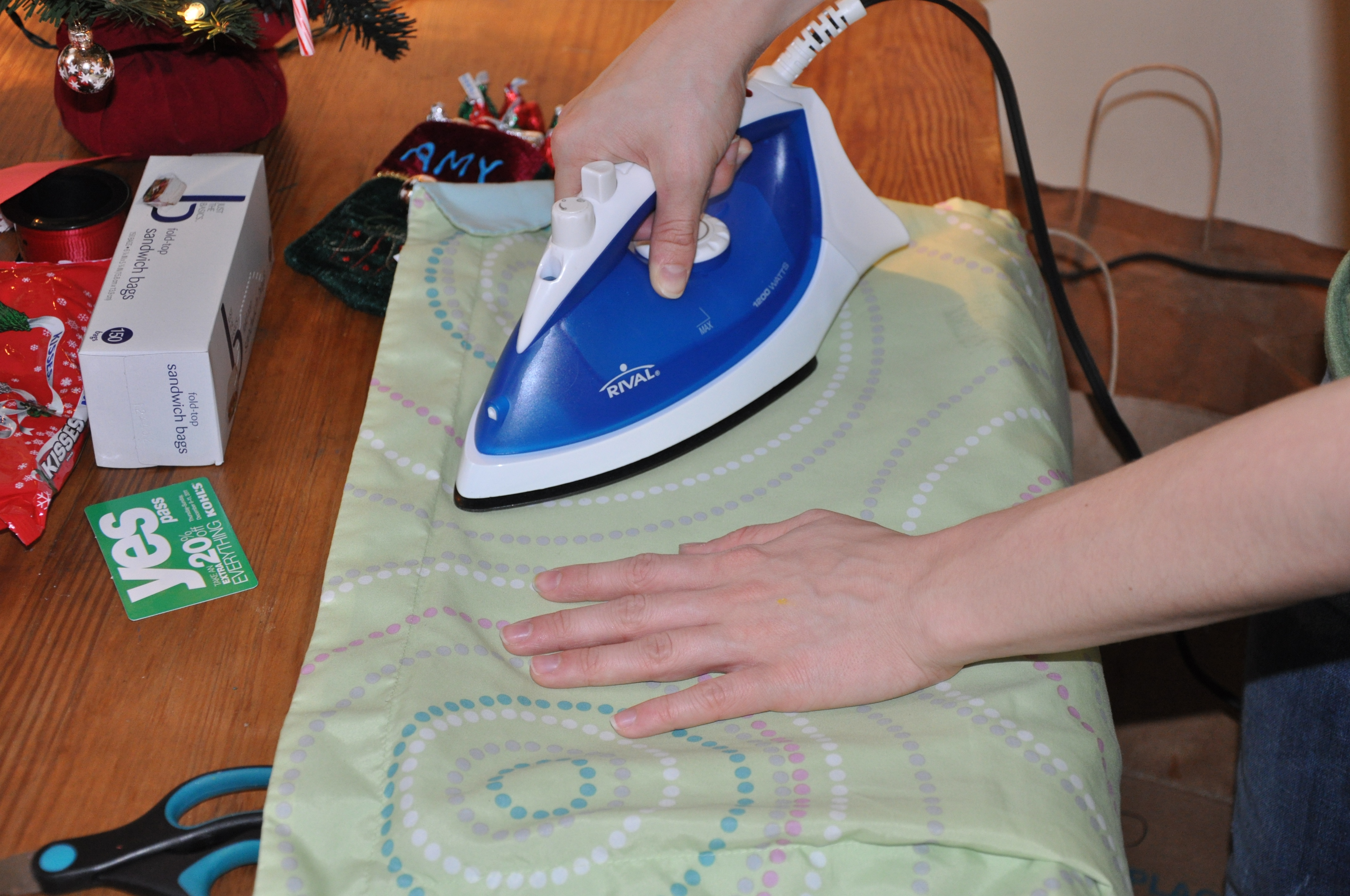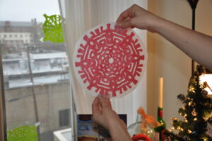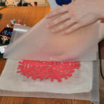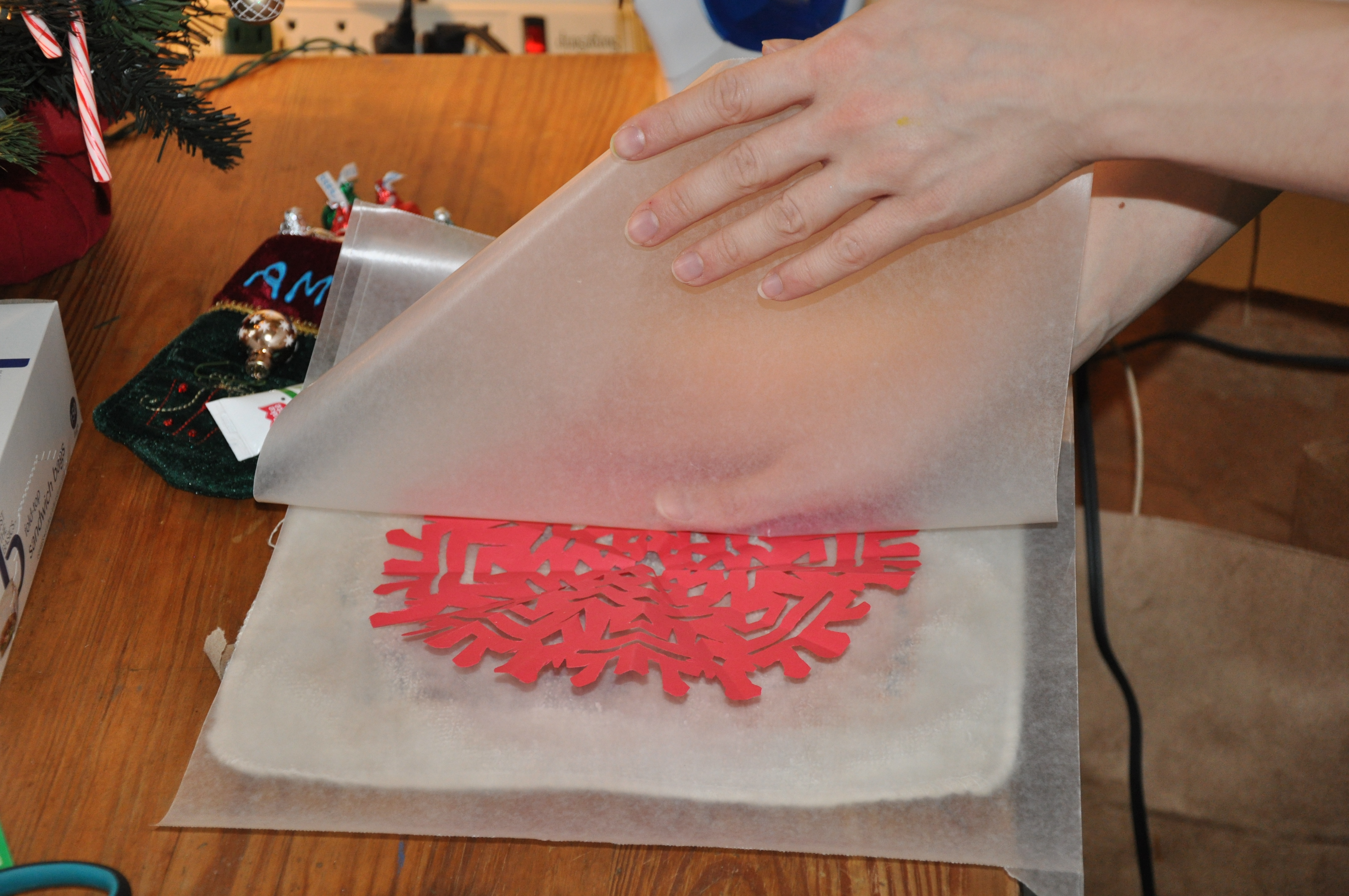 While decorations dry, heat the iron and tear off 2 sheets of wax paper — make each an inch larger than the snowflake on all sides. Lay the snowflake in the center of one wax sheet on a flat surface. Lay the second sheet of wax paper on top. Take a towel or piece of fabric and place it over the snowflake pile, careful not to move the wax paper. Then, lay the hot iron on the towel and iron gently, not pressing hard, for 5-10 minutes, being sure to get all corners and press out any air bubbles.