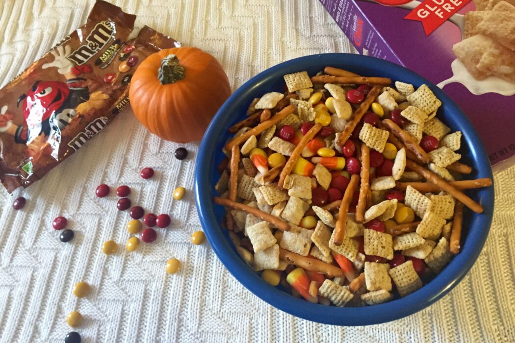 5. In a large bowl combine, Peanut M+M’s, Mini Reese’s Peanut Butter Cups, Salted Peanuts, Caramel Kettle Corn, Candy Corn and Pretzels and cooled cereal mixture and munch away!