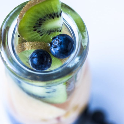 Adding a handful of fresh blueberries and a thinly sliced kiwi to water is a delicious way to get some nutrients into your body. Blueberries can protect against heart disease and can even improve mental health. Kiwis support digestive health and boost the immune system.