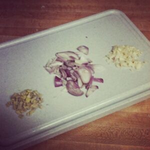 11. Warm a pan on medium heat with a few tablespoons of olive oil. Add ginger, garlic, shallots and lemon juice to pan.