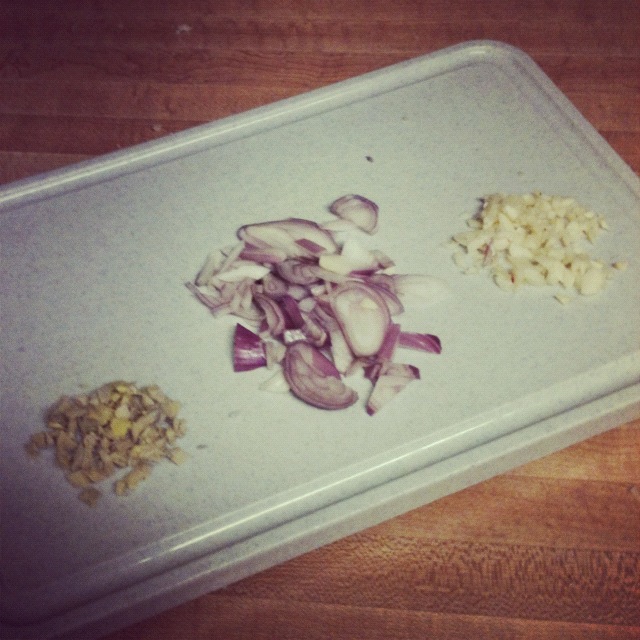 10. Peel and mince ginger and garlic, and roughly slice shallots.
