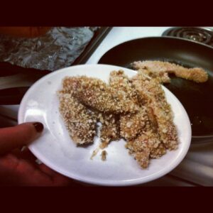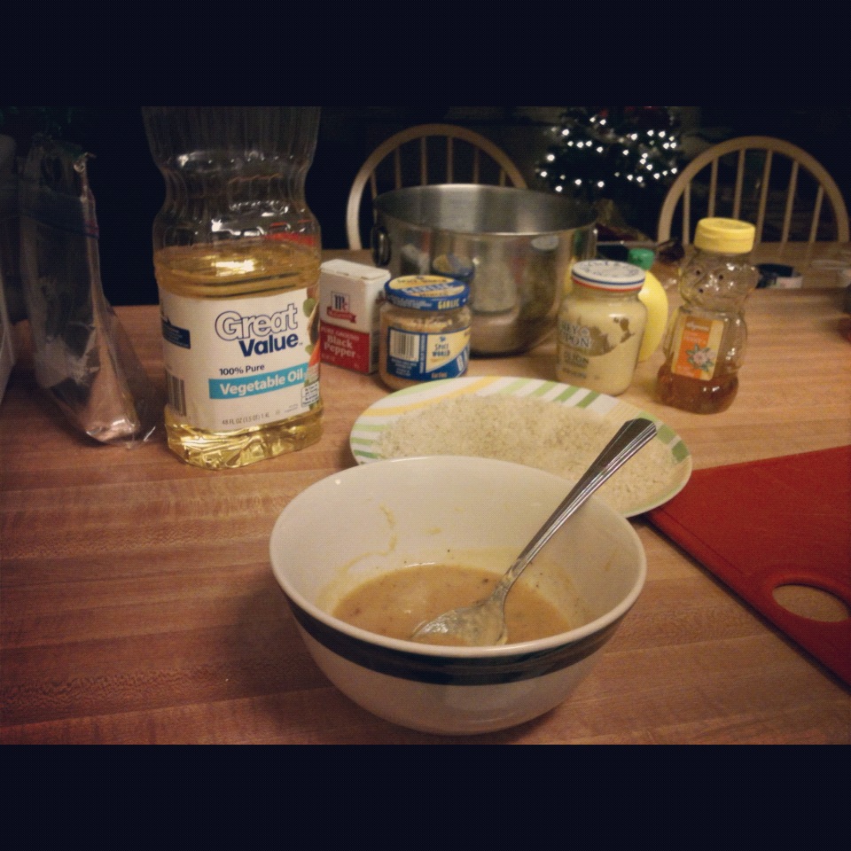 5. Coat chicken strips in honey-dijon mixture, then in panko crumbs. As you go, lay them on a plate.