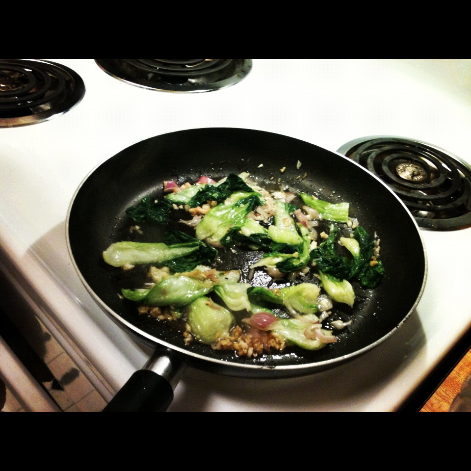 12. Once they start to brown, add the bok choy. Toss occasionally to coat the bok choy with fresh flavor.