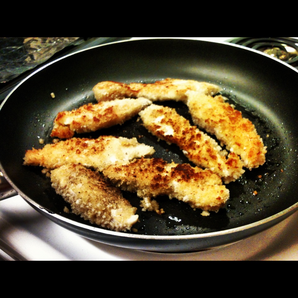 7. Once the pan-side of the chicken turns golden brown, flip strips.