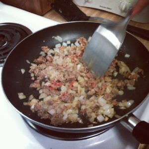 5. Slice and dispose of the sausage casing so the meat can be more easily broken up in your pan. Once the onions are golden brown, add meat and well-drained spinach, breaking up the meat with a metal spatula.