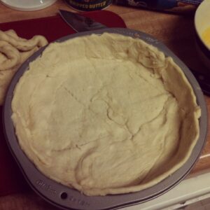 10. Using Pillsbury crescent rolls, thoroughly cover the base and sides of the pie pan.