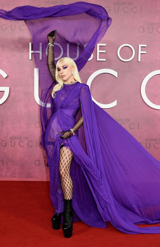 For the first premiere on Nov. 9, Gaga opted for a luxurious a purple Gucci ensemble, with eye makeup to match. She paired the gown with fishnets and platform boots along with Tiffany & Co. accessories.