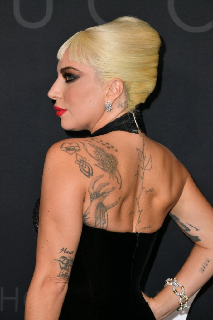 You can never go wrong with a black dress moment. Gaga graced the New York City premiere on Nov. 16 in a custom black velvet Giorgio Armani Privé gown. The tulle bow, red lip and updo created a chic look while her dress showcased her tattoos as well.
