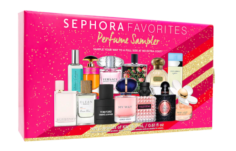 - This sampler set allows you to try out 13 perfumes ranging from Marc Jacobs Daisy Love to Prada Candy for a fraction of the price of one. After trying out the samples for your new signature scent, a scent certificate is included to redeem a full size of your favorite. It definitely helps you save a few dollars all while letting you try out a range of different scents.