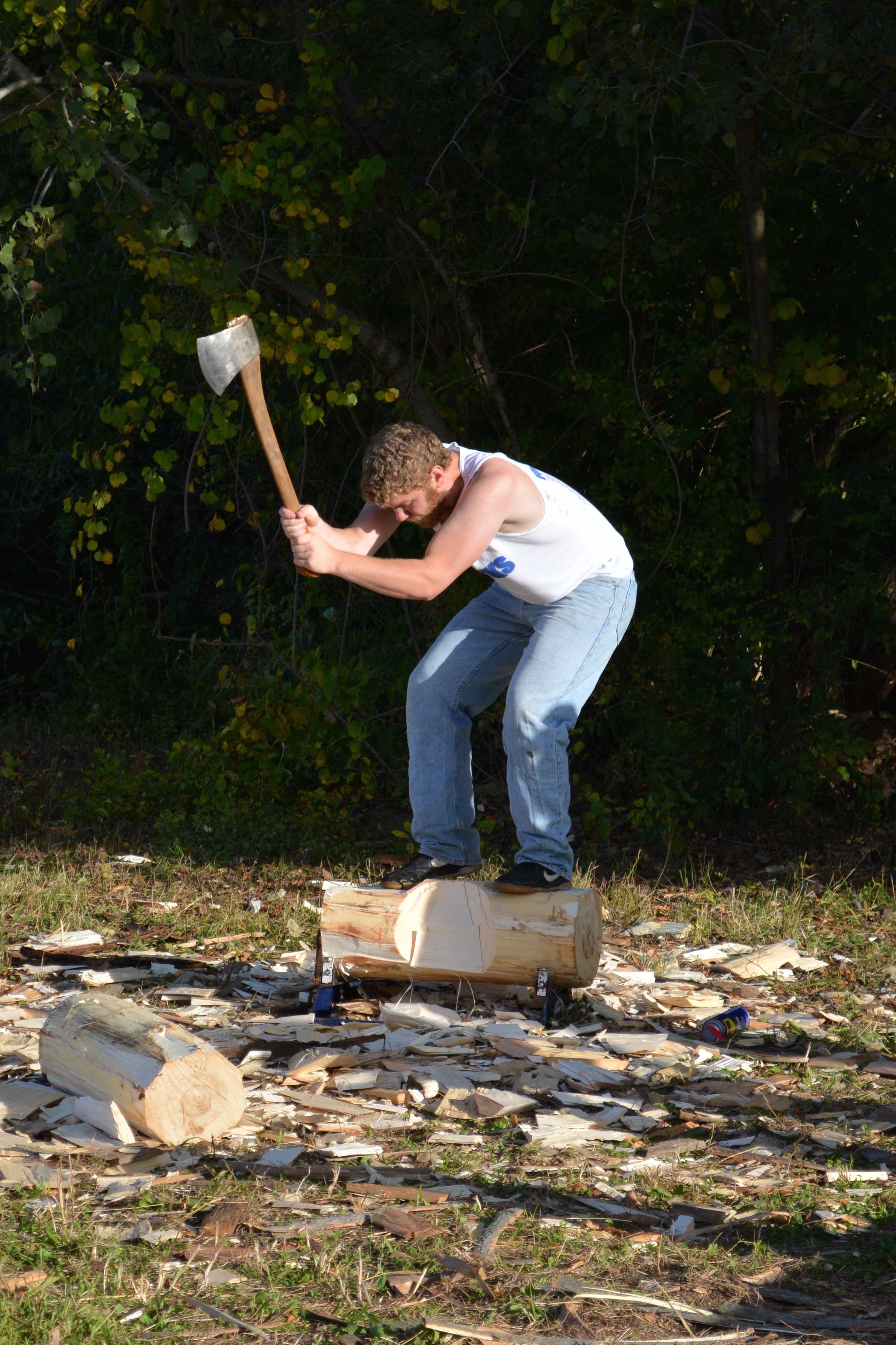 “Speed is nothing without accuracy,” a member instructed as another member was attempting the vertical chop. During the vertical chop event, competitors secure their wood to the top of an upright stanchion typically two feet above ground level. The contestant must then chop halfway through the front of the wood positioned upright, then step around the wood and finish chopping through the back side.