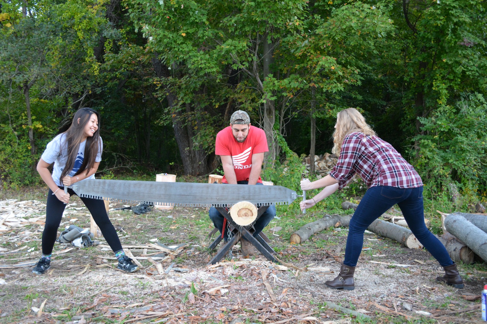 Self-Improvement Editor Amelia Friedrichs and Valley photographer Skylar Yuen try their hand at sawing a log.