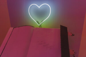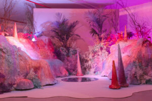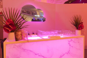 “everytime” speaks of past relationships and love that has come and gone but that we may still be stuck on. Lit in a bright pink glow, a marble bar is lined with mocktails and snacks for fans to take a break and replenish themselves with before finishing the exhibit.