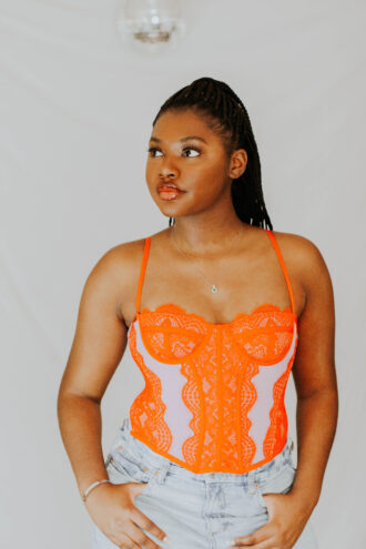 What are they wearing? How are they standing out from the rest of the room? How is their shirt making it look like there’s a…