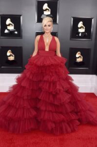 After recently making headlines for having brands decline to dress her, Bebe Rexha wore a plunging red ruffle Monsoori gown. “I want to have a Cinderella moment: I want it (the dress) to be so hard to walk in. I can’t believe that I am finally nominated for a Grammy, two Grammys! For me this is my Cinderella moment,” Rexha told Ryan Seacrest during “E! Live from The Red Carpet”.