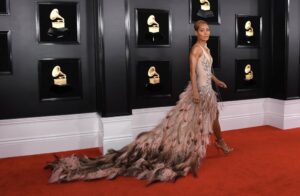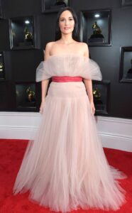 Album of the Year winner Kasey Musgraves kept things light and airy in Valentino, in honor of her album Golden Hour. “I love this dress — it immediately struck me because it reminded me of the fan that was on my album cover,” she told PEOPLE on the red carpet.
