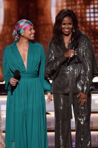 Technically not on the red carpet, but a surprise appearance from Michelle Obama can only mean one thing — another sparkling moment from the former FLOTUS (throwback to her knee high Balenciaga boots). She wore a floor length sparkling jumpsuit with a tie waist and delivered opening remarks alongside J Lo, Lady Gaga, Alicia Keys and Jada Pinkett Smith.