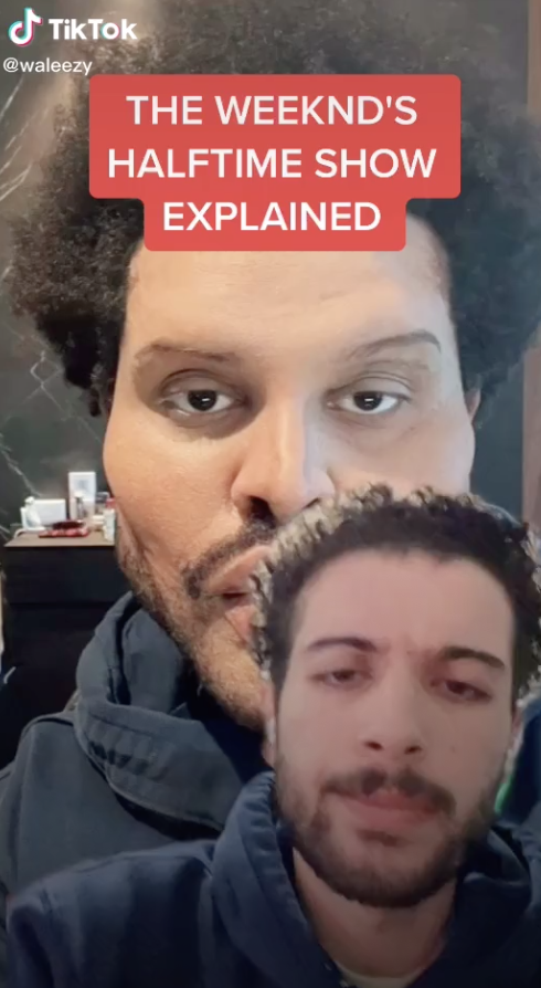Tik Tok creator, @waleezy, goes into detail about The Weeknd’s struggle throughout Hollywood. At the beginning of the halftime show, The Weeknd is just trying to chase his dreams of becoming a singer. He performs “StarBoy” while dancing with a city behind him. Then the show goes into him singing “Can’t feel my face”. He is running around the gold, mirrored room alone as he is confused, gets bombarded with the different versions of himself-the bandaged dancers and quite literally cannot feel his face because it is plastic.