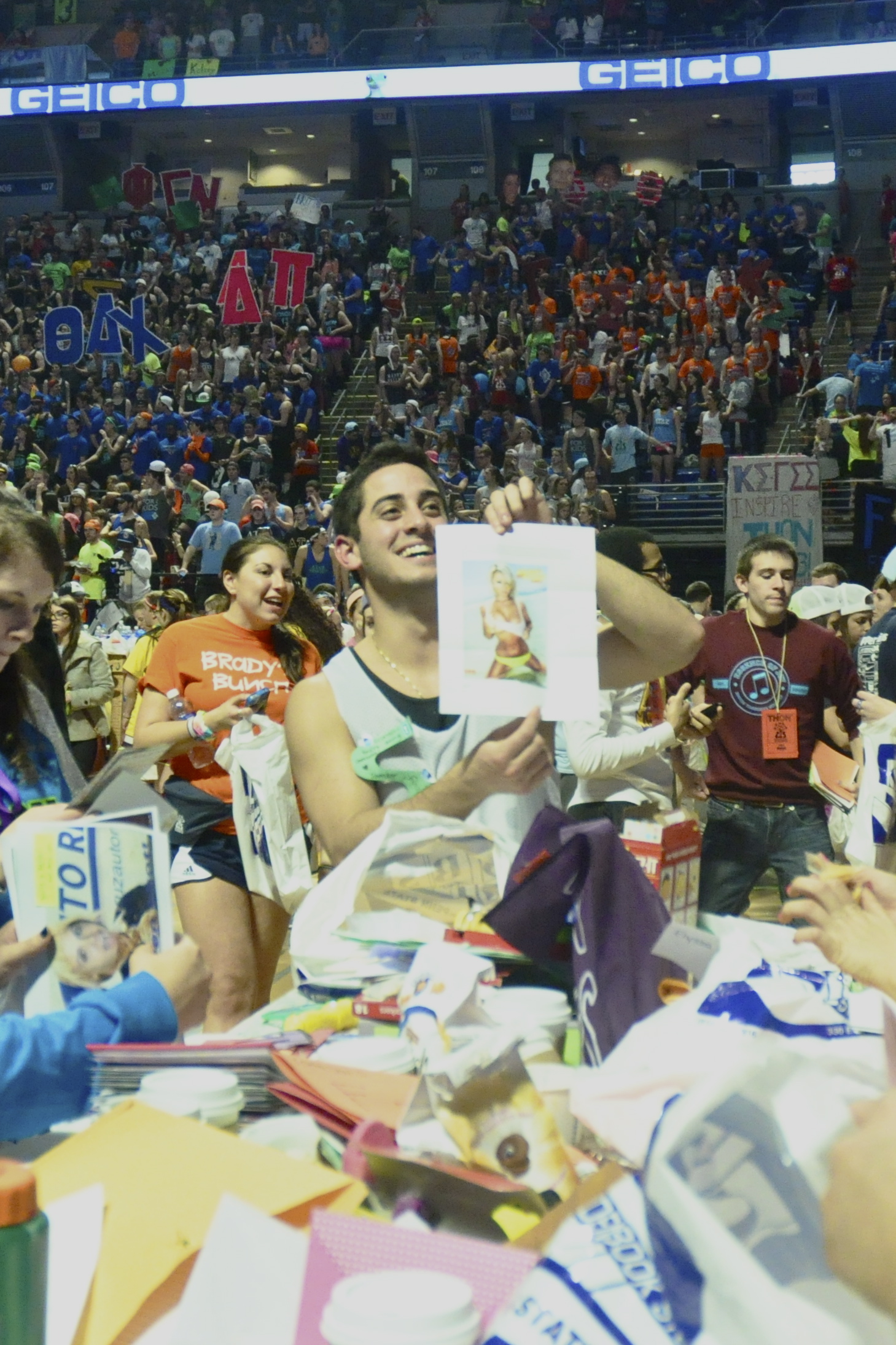 Joe Scordo, dancing for Sigma Alpha Mu, looks up in to the crowd to find which friend was responsible for his risque picture. His next note brought on a different kind of emotion.