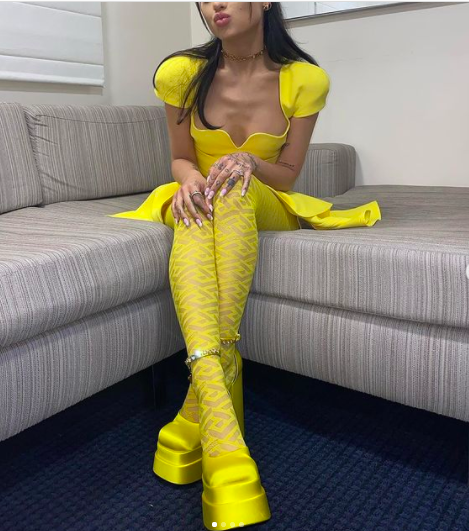 Grande first appeared to wear this whole ensemble on a segment with James Corden for “The Late Late Show with James Corden.” She wore these platform heels in the color yellow, accessorized with Versace’s Satin Mini Dress shown in the Fall/Winter 2021 Runway Show.