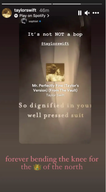 Sophie Turner had the perfect response when she posted the song to her Instagram story and tagged the songwriter saying “It’s not NOT a bop.” Swift, a known “Game of Thrones” fan, then replied by saying “Forever bending the knee for the [queen] of the North.”