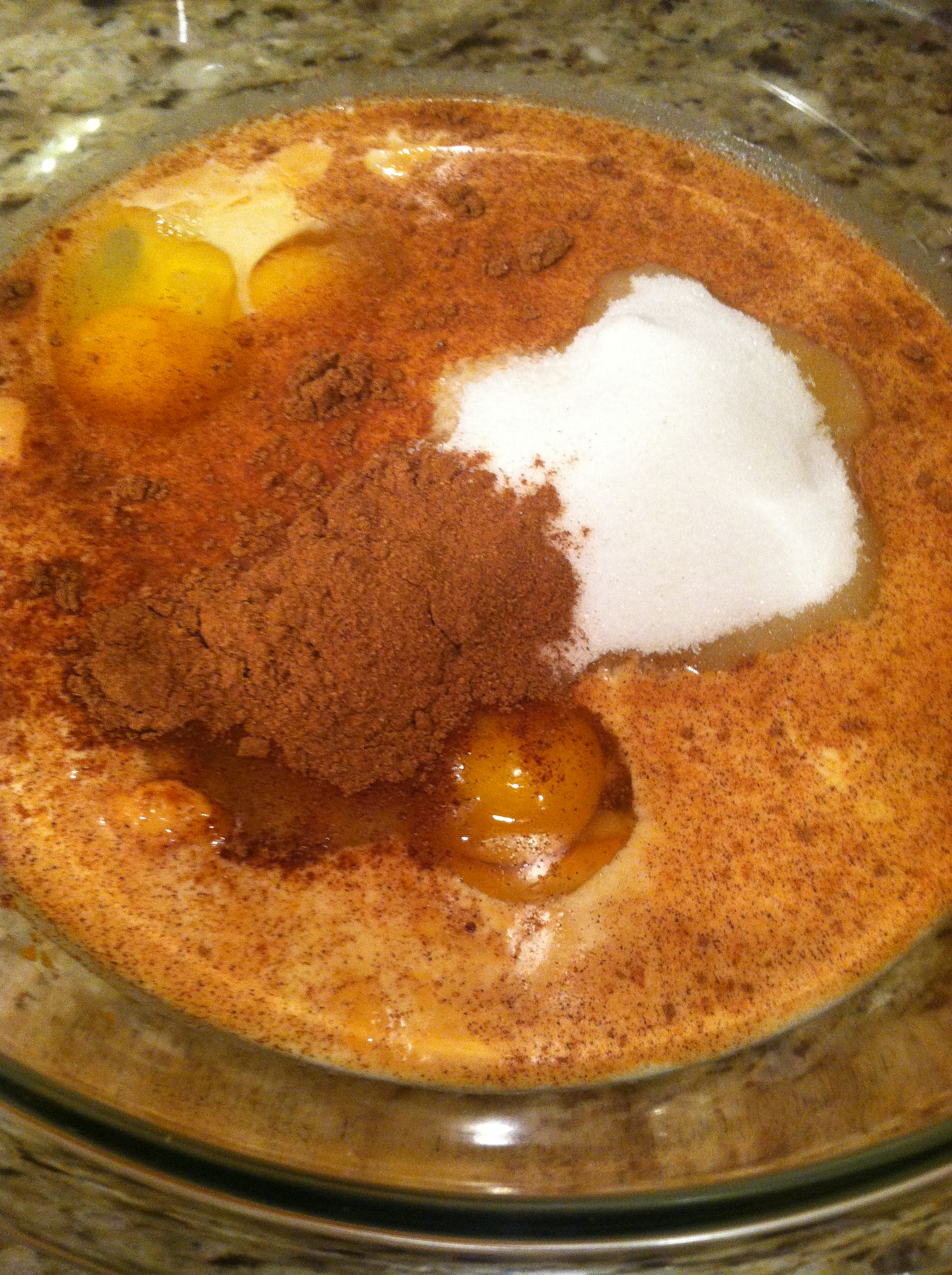 3. Combine pumpkin, evaporated milk, eggs, sugar, pumpkin pie spice and salt in a large-sized bowl