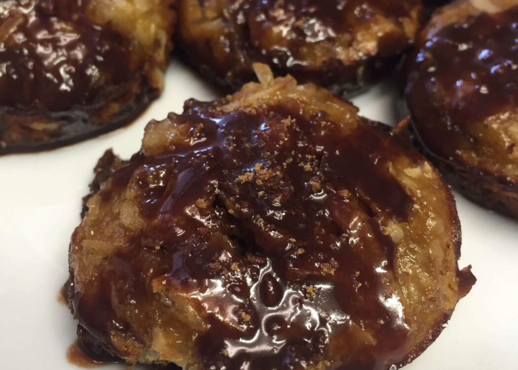 2. In a large bowl, mash bananas. Add egg, coconut, coconut sugar, vanilla, butter and salt and stir until mixed thoroughly and smooth.