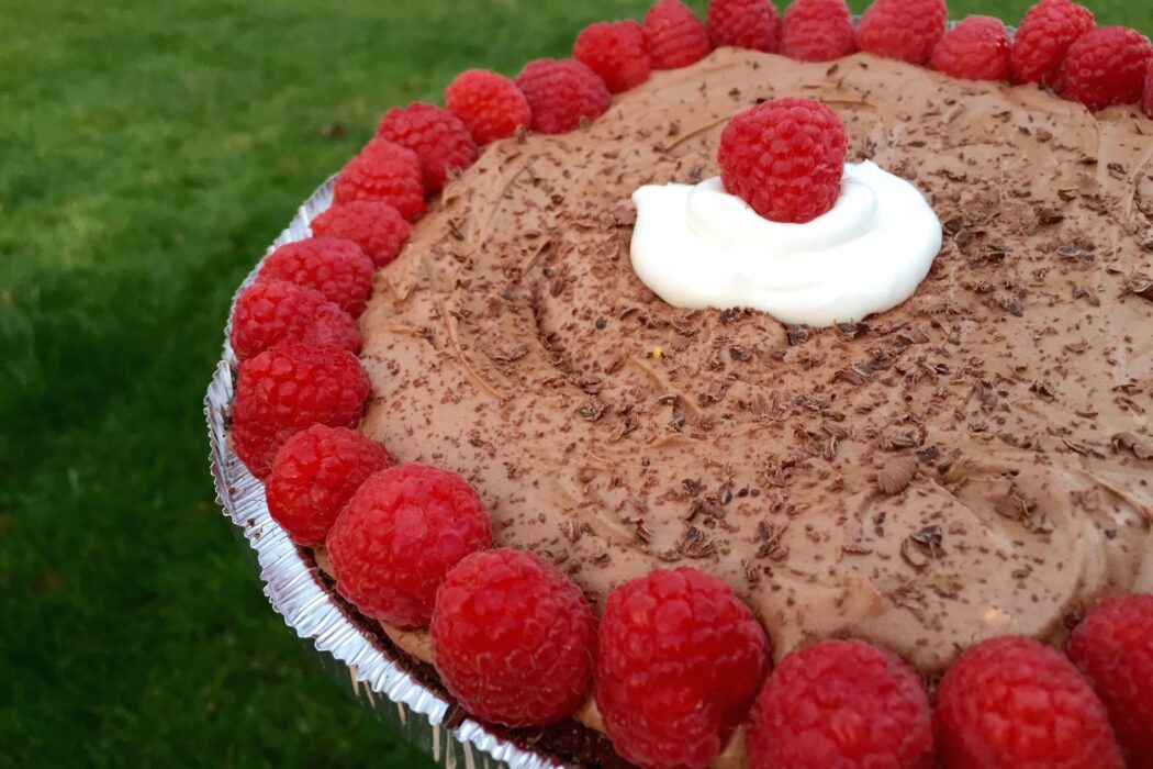 5. For decoration, take extra whipped cream and raspberries and garnish the top of your pie.