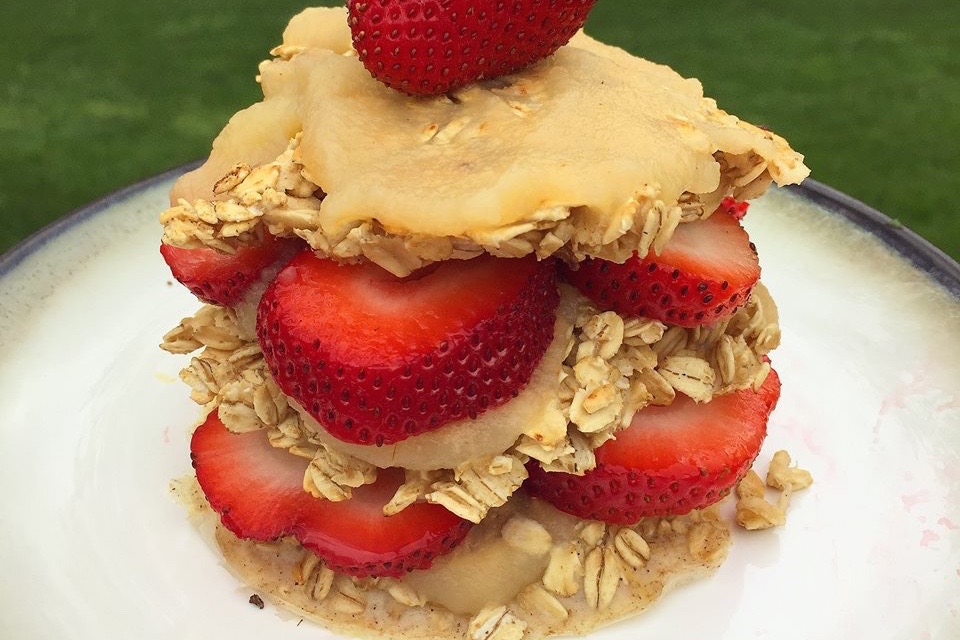 4. To make the ultimate oatcake stack, first place one oatcake on a plate and then top it with your desired amount of applesauce and strawberries. Continue this pattern until all your oatcakes are stacked. Feel free to add any extra cinnamon, applesauce or other additional toppings on top.