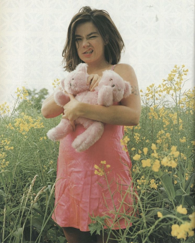 The logo of the collection that appears in many of the designs is a dual-headed bear, inspired by the one seen in a 1994 photograph of Jacob’s longtime muse, Katie Grand that appeared in Dazed Magazine— as seen above.