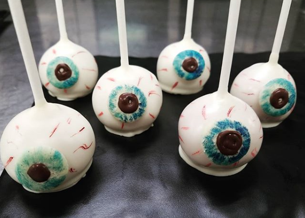 - Add the eyeball candy to the center of the cake pop, and draw in veins with the red gel icing.