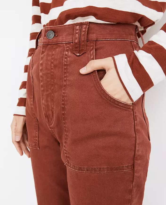 Carpenter jeans are another cut that is on trend this fall. From high to low rise, these bottoms provide a solid base to build the perfect fall look with. They’re unique in their belt looping and stitching and come in a wide array of colors. This high-rise pair from Madewell features a burnt red-orange color and large pocket stitching.