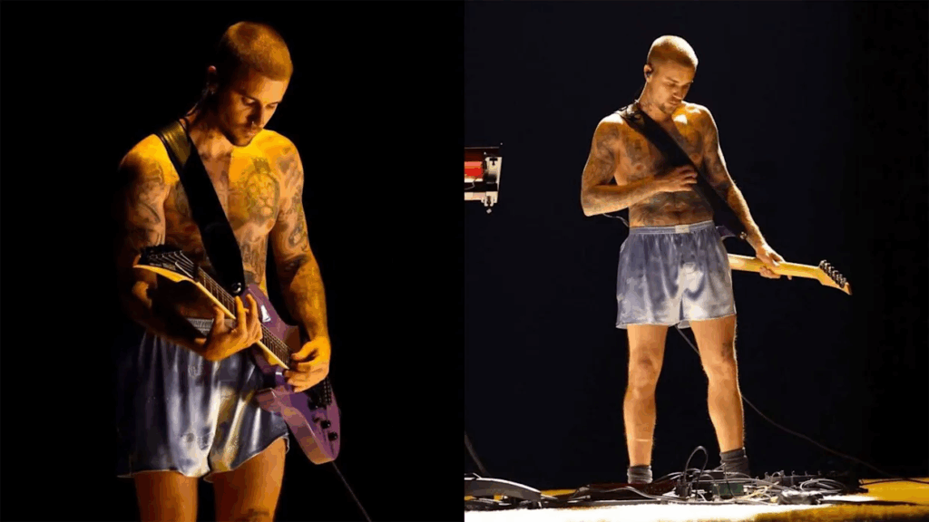 Justin Bieber returned to the Grammy’s stage for the first time since 2022, wearing nothing but boxing shorts, socks and his guitar strapped around his shoulder. He performed “Yukon” from his recent 7th studio album titled “Swag” and served pure vocals, complete with an unapologetically distant stage demeanor— spending most of the performance looking down at his guitar and drum pad.