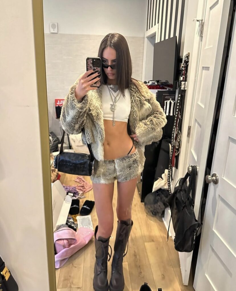 In a world where winter-wear is often resigned to practicality, Ashtin turns the seasonal norm on its head with a skin-baring Y2K statement. At the heart of this ensemble is a cropped faux fur jacket and matching mini shorts set that creates dimension. Laced-up combat boots tie the look together while layered necklaces drip decadence. Her look shows that dressing for the season should be interpretive.