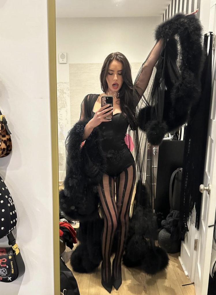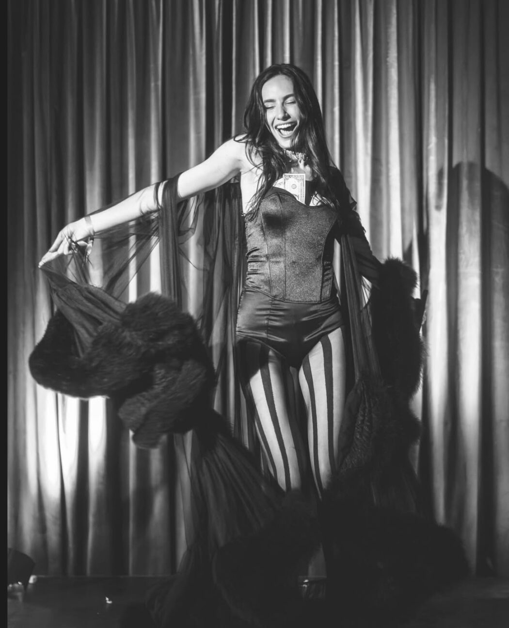 Ashtin Earle brings a dark twist to birthday glamour. It’s an unapologetic celebration of self-expression, confidence and theatrical flair. The ensemble commands attention with vertical striped tights accompanied by a satin bodysuit and gold choker. Over the bodysuit, Ashtin drapes a voluminous, sheer black robe. The look is a pure example of being fearlessly bold in your fashion and exploring patterns.