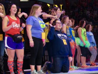 Students, alumni, and local salon employees alike crowded on the BJC stage today for one of the most heartfelt hours of THON; the Wigs for Kids hair donation.
