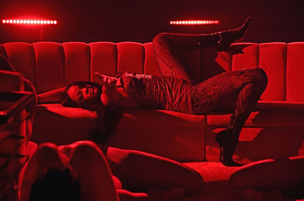 BIA then pulls back the curtain to reveal the next performer, Normani singing “Wild Side” in a red room. During her performance filled with stunning close-ups and flexible moves, she is wearing a beaded green bodysuit adorned with black mesh and paired with a pair of clear high heels.