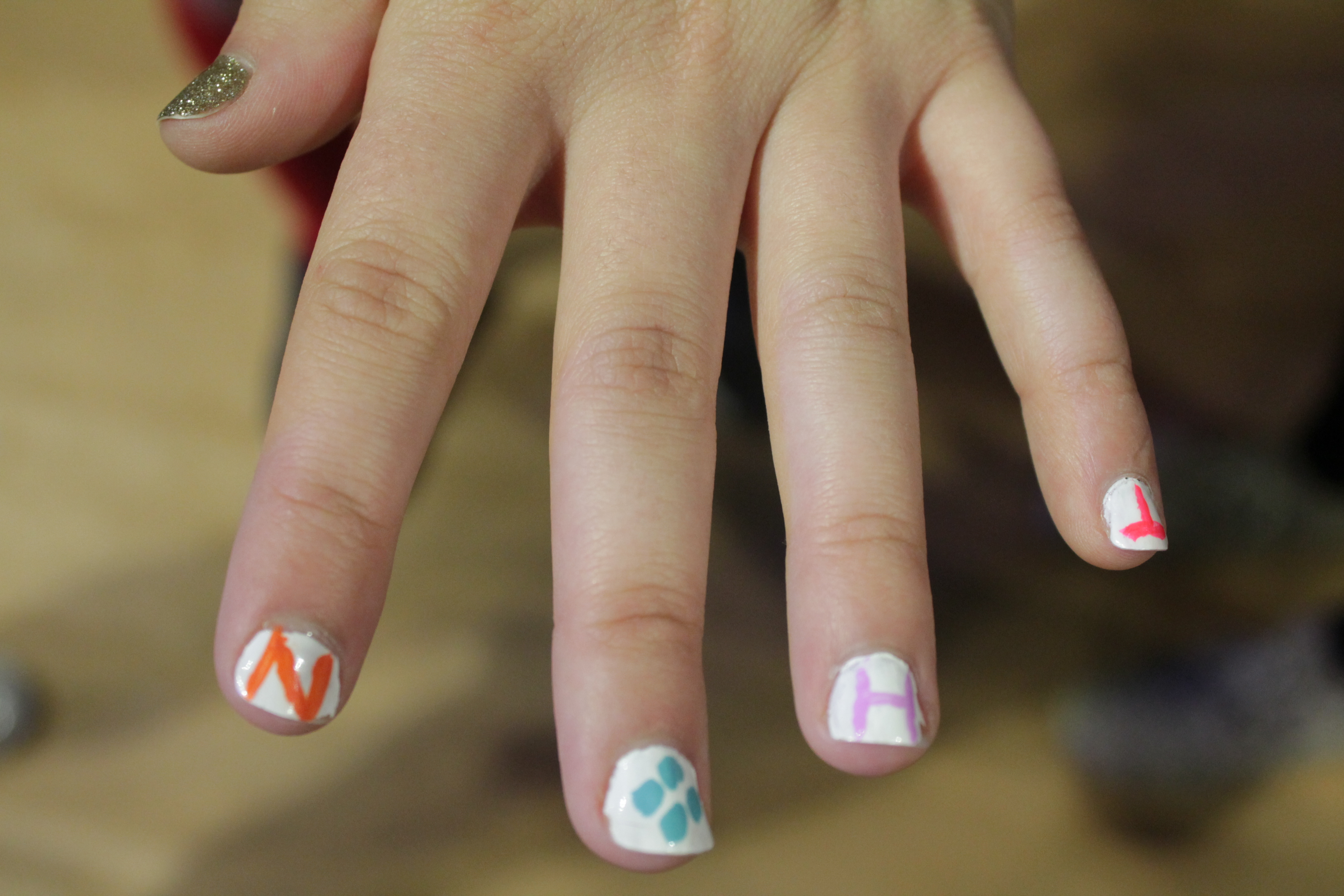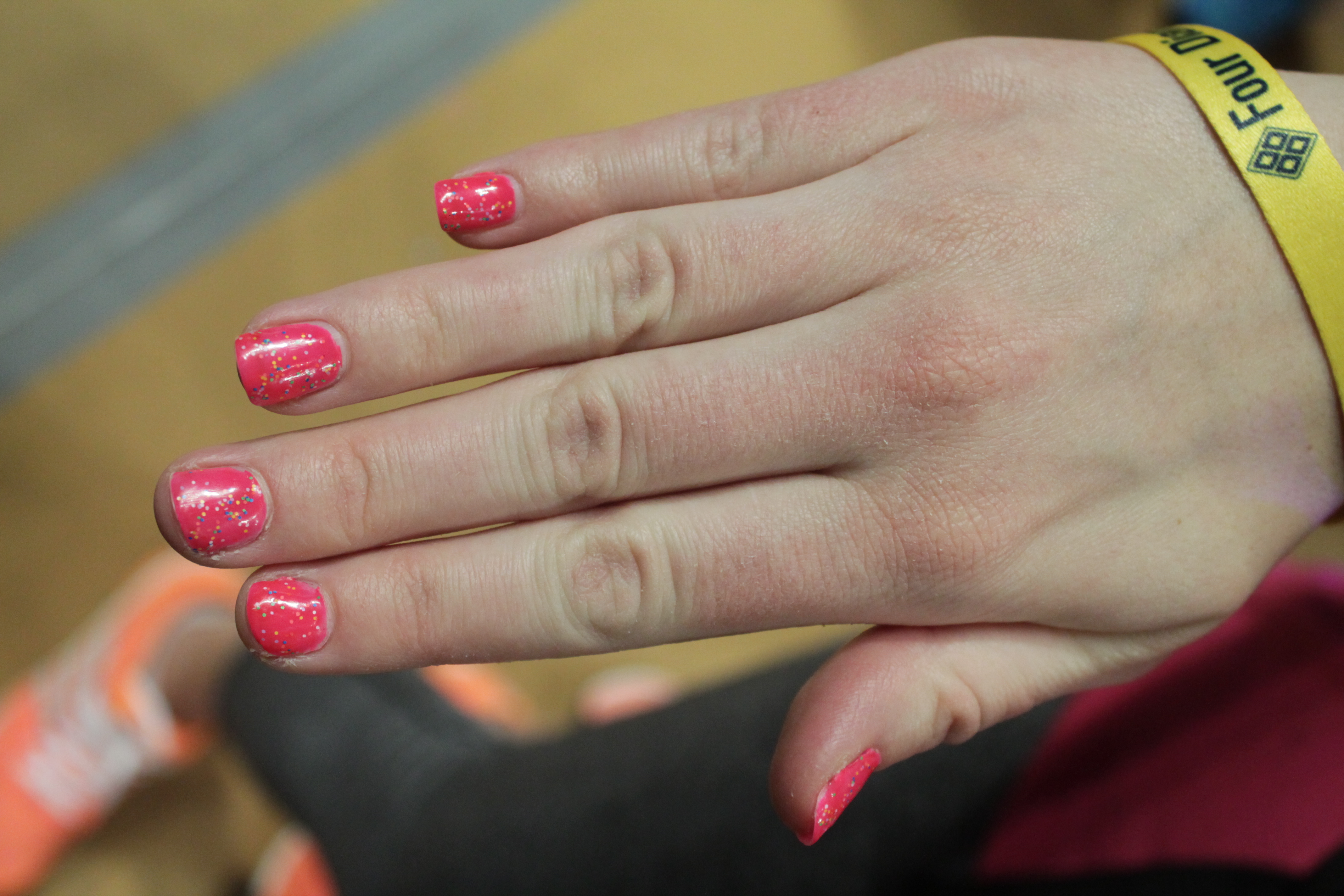 1. Maddie Brown (Gamma Sigma Sigma) chose to paint her nails a pretty pink and add some colorful candy-colored specks. “I just wanted something fun and festive for THON,” she says.
