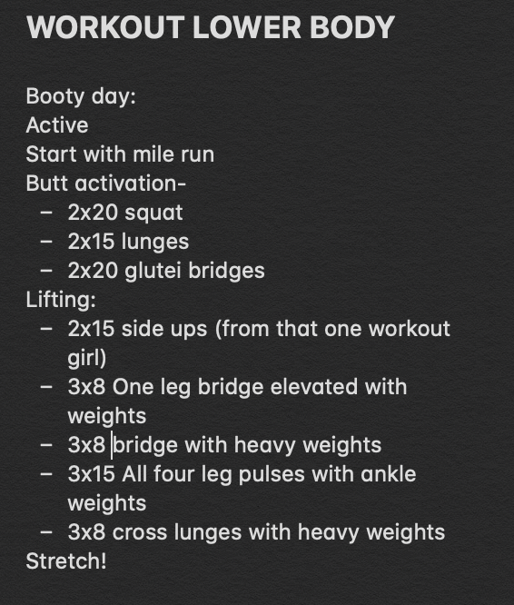 First, always come with a plan. VALLEY suggests writing a workout plan in your notes on your phone before coming to the gym. This way, you won’t be confused or waste time, and you can get in and get out having done the most efficient workout possible. Below is an example of what a workout plan would look like on your notes.