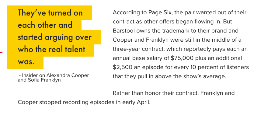 In summary, Cooper and Franklyn wanted contract changes and their IP (intellectual property) from Barstool—after their contract ended. Since “Call Her Daddy” was so successful, Portnoy agreed to their terms to keep the podcast around.