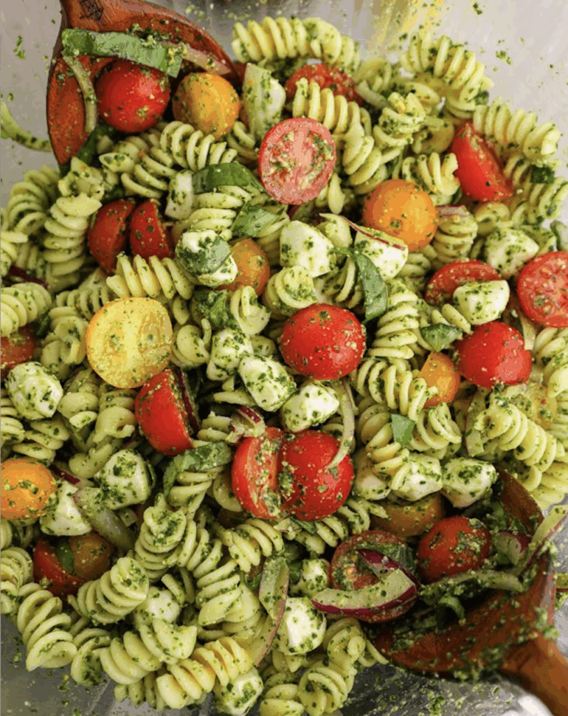 On a similar note with a caprese theme, we have a pesto pasta salad filled with bold and herbaceous goodness, topped with a garlicky punch of pesto with a nutty finish. This screams summer in a bowl and is the perfect dish for barbecues and potlucks.