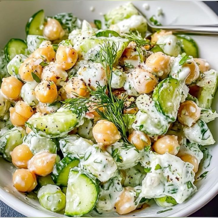 This protein-packed chickpea salad fills your mouth with a fresh, zesty flavor and a hint of Greek style. The tzatziki adds a creamy element and essence to a bowl, perfect as a side dish. The added parsley and dill give the salad that extra tang it needs.