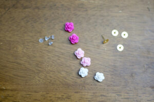 3. Arrange the flowers in any design you like, and hold onto the earring. We decided to put three different colors on each earring.