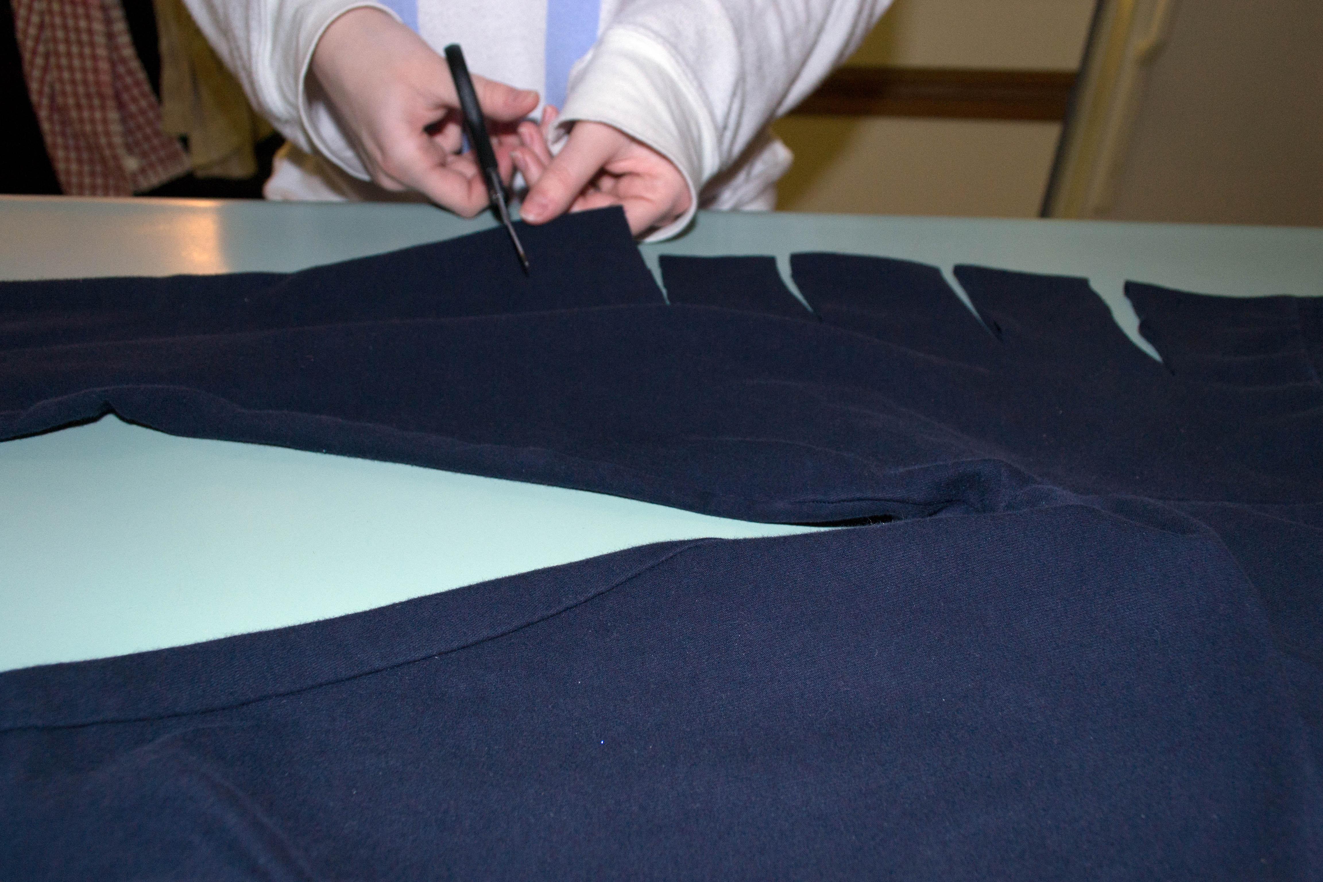 Begin to cut straight across both sides of the fabric. How deep you want to cut totally depends on your desired look, but less is more. You can always try on the finished look and cut deeper slits if you don’t like what you have already cut.