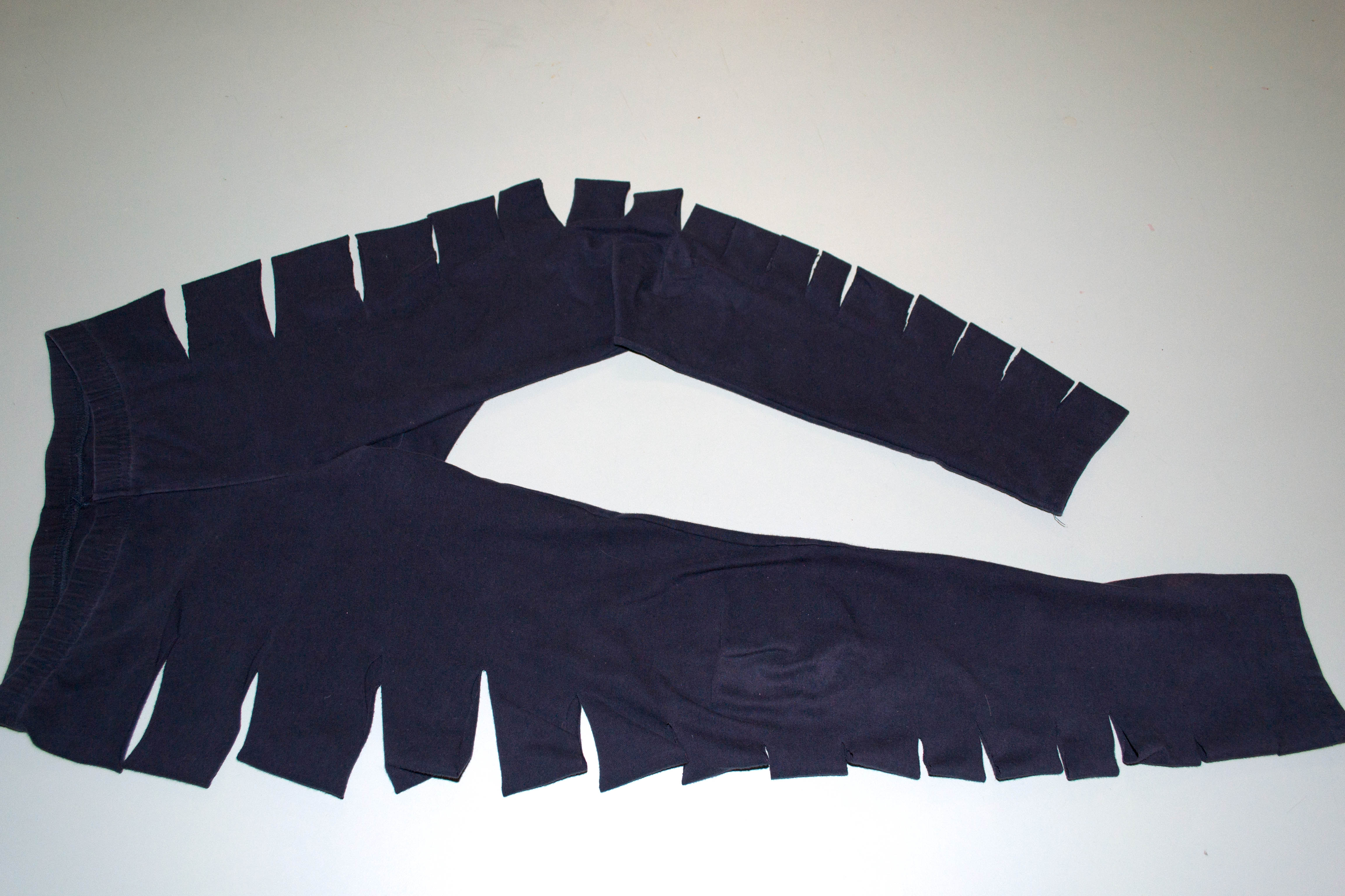 Continue to cut slits until you reach the bottom of the leggings. Once the first leg is complete, do the same steps on the other side.